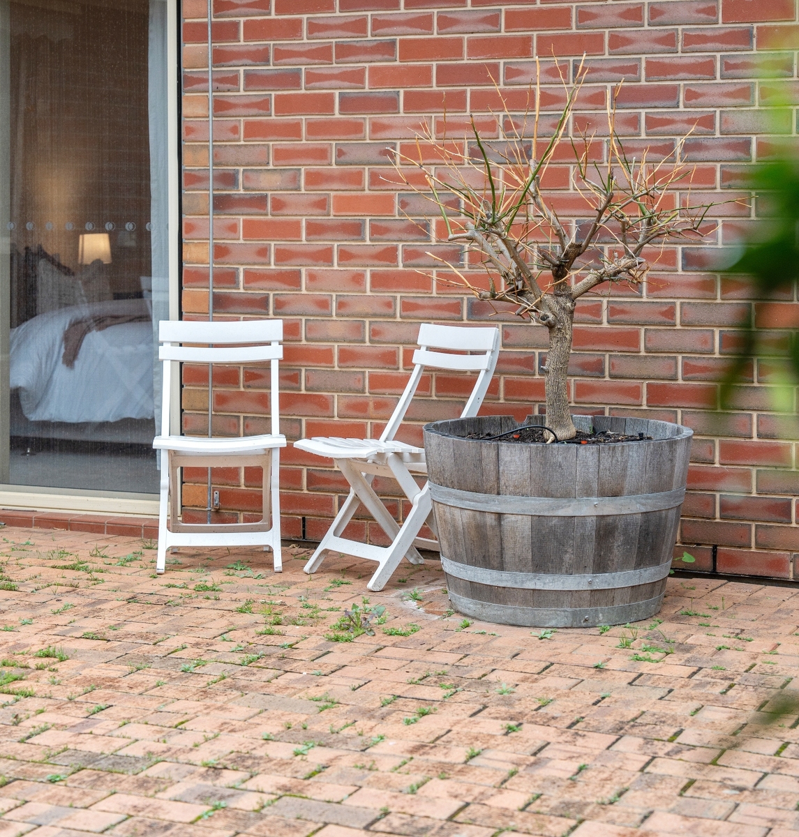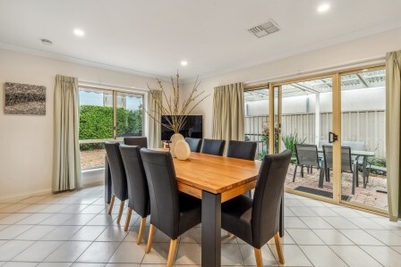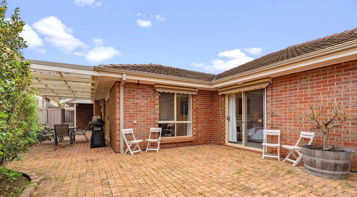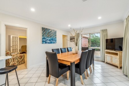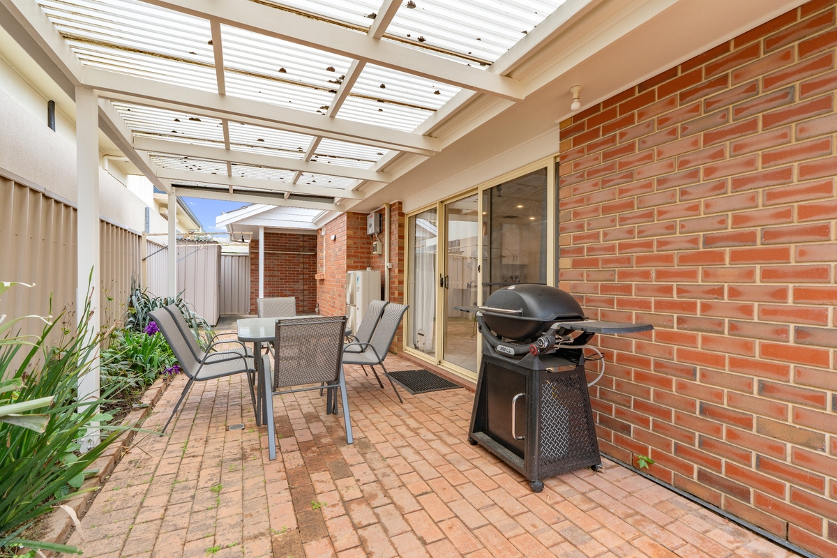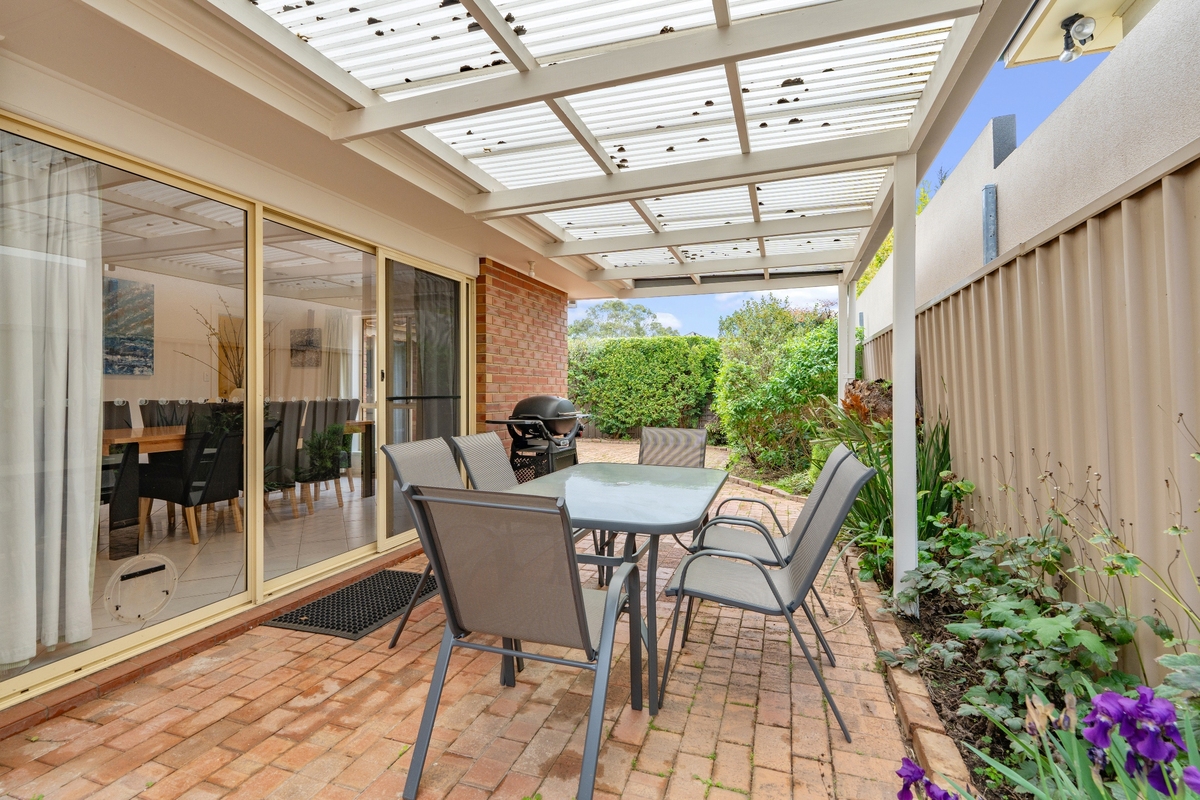 Outside, the private backyard patio is set up for relaxed outdoor dining with a six-seater table and BBQ facilities.