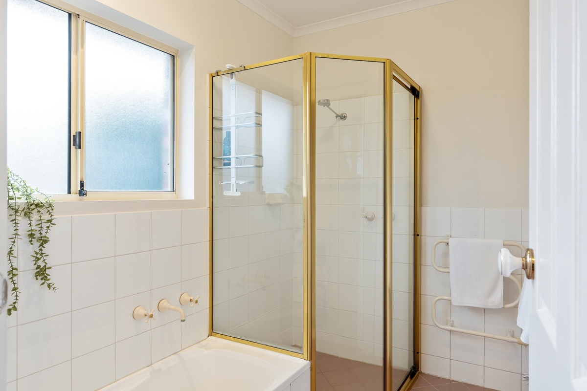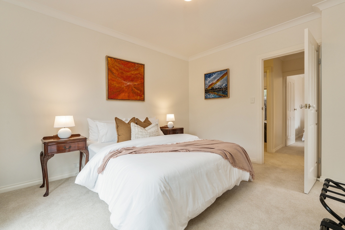 The master bedroom is located at the rear of the home and offers a peaceful sanctuary with a queen-size bed, walk-in wardrobe, and two-way access to the main bathroom. This bathroom includes a bathtub, walk-in shower, vanity, and mirror, along with a separate toilet.