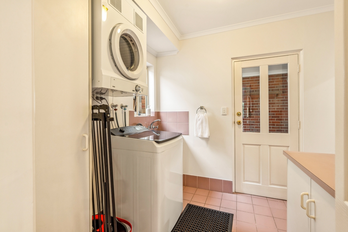 A fully equipped laundry room includes a washing machine, dryer, laundry sink, and storage, along with a second toilet, making the home practical for longer stays.